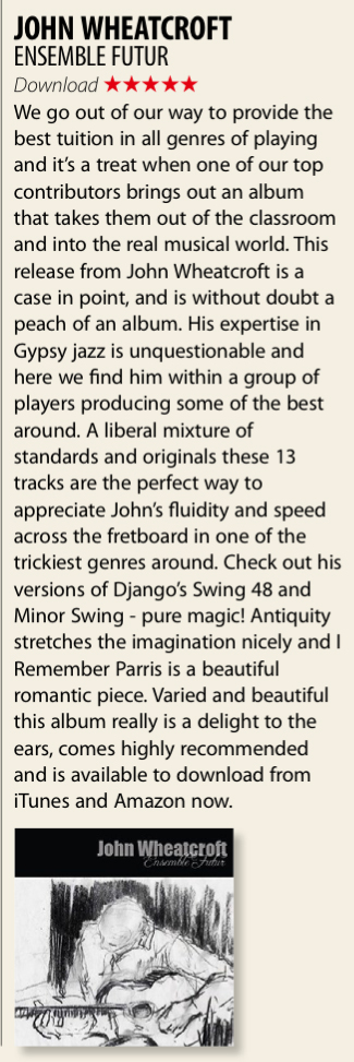Guitarist John Wheatcroft’s Ensemble Futur seamlessly integrates the sound and approach of modern jazz with the timeless Franco-American swing of the legendary Django Reinhardt, producing a sound that is both rooted in the traditions of the genre and vital, forward thinking and is highly original.